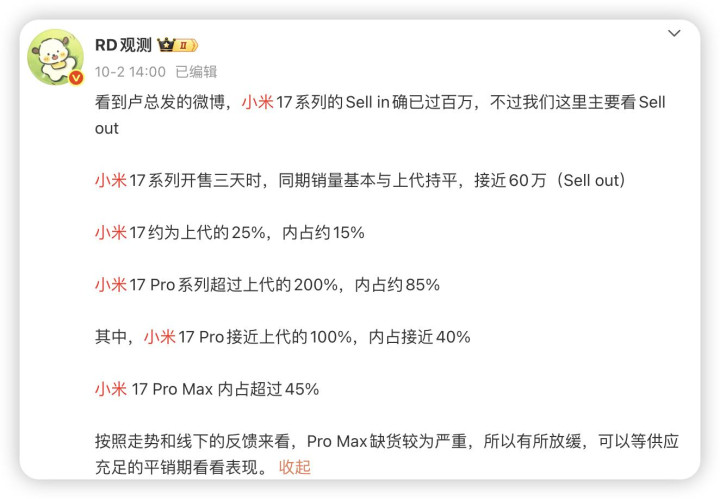 具体来说,小米17 Pro占据全系总量约40%,小米17 Pro Max占据全系总量约45%,也就是说小米17 Pro系列加起来占据了85%的量,同期约为前代的280%,这也意味着小米这次可谓是量价齐升,其在高端市场自然是取得了更大的进展。