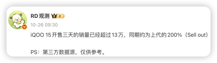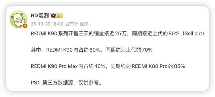 根据博主的爆料,iQOO 15开售三天销量就超过了13万台,红米K90 Pro Max首销三天大概是10万台,而小米17开售三天销量大约是15万台,虽说这个数据比子系旗舰的销量要高,但相比以前的差距是大幅缩小了。