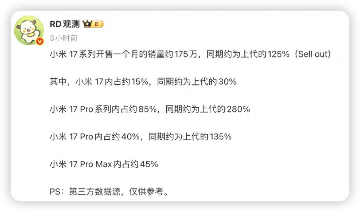 最近博主曝光了小米17系列开售一个月的激活销量情况,总量约为175万台,同期约为上代的125%,看这个总量数据还是挺不错的,但拆开具体的细节,只能说小米17系列这次是有喜也有忧。