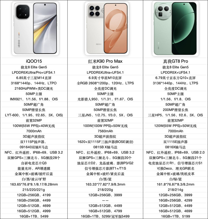 而且这些子系旗舰还有比较突出的卖点,像iQOO 15主打的是电竞体验,红米K90 Pro Max主打的2.1声道外放体验,真我GT8 Pro主打2亿像素大底潜望+理光GR联名的影像体验,这些差异化的内容也获得了市场的认可。