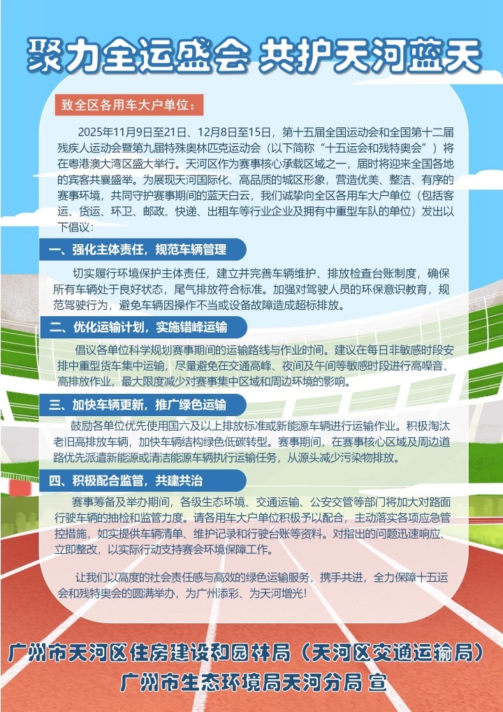 近日,为全力保障十五运会和残特奥会期间的环境空气质量,广州市生态环境局天河分局、天河区住房建设和园林局(区交通运输局)、天河区城市管理和综合执法局针对与空气质量息息相关的五类重点对象,共同发出《聚力全运盛会 共护天河蓝天》系列倡议书,变“监管”为“共治”,化“要求”为“邀请”。