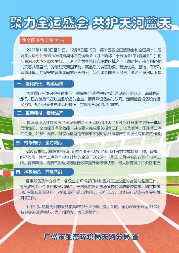 这五封“蓝天邀请函”,没有强制命令,只有真诚的呼吁与共同的约定。大家对设备的一次清洗、生产的一次错峰、加油时间的一次调整,都是对体育盛会最实在的支持。当运动员在通透的蓝天下拼搏,当游客赞叹“广州蓝”的澄澈,那抹湛蓝中必将映着广州各行各业守护的身影!