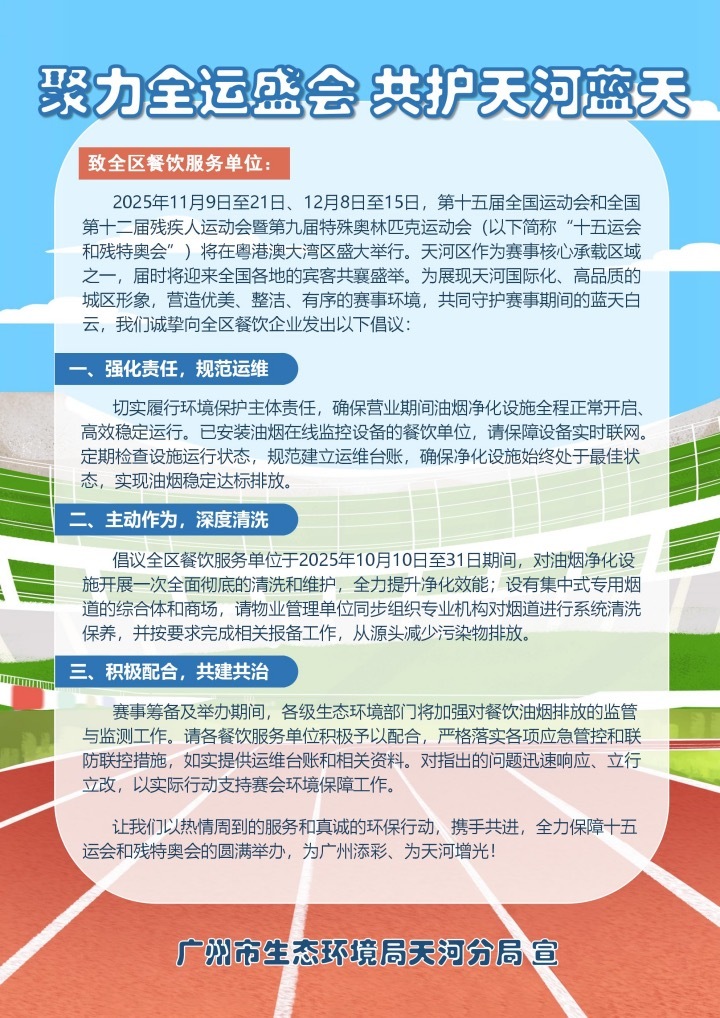 这五封“蓝天邀请函”,承载着对赛会美好环境的共同期盼。致餐饮界的“烟火英雄”,呼吁餐饮行业在10月为油烟净化设施进行一次“深度SPA”,确保它在赛会期间高效运行,让美味飘香不留扰人烟缕。